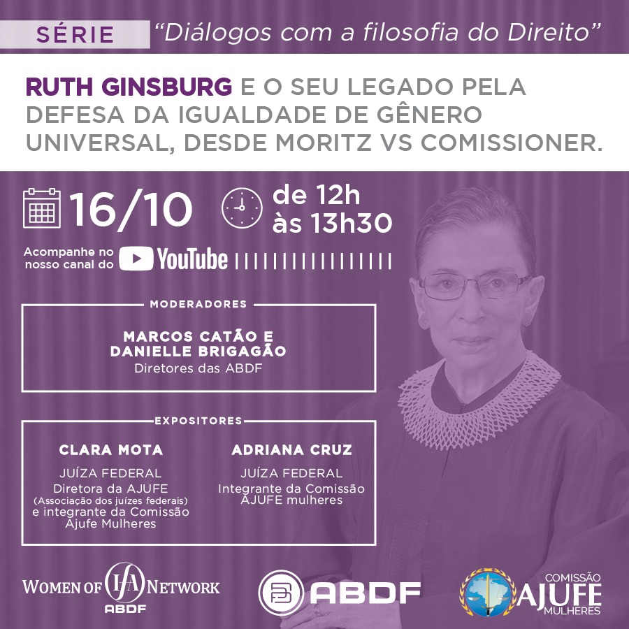 No dia 16/10, às 12:00h, a ABDF promoverá o webinar “Série: Diálogos com a filosofia do diteiro. Ruth Ginsburg e o seu legado pela defesa da igualdade de gênero universal, desde Moritz vs Comissioner.” Este é um evento da WIN – Women IFA Network em parceria com a Comissão AJUFE Mulheres.