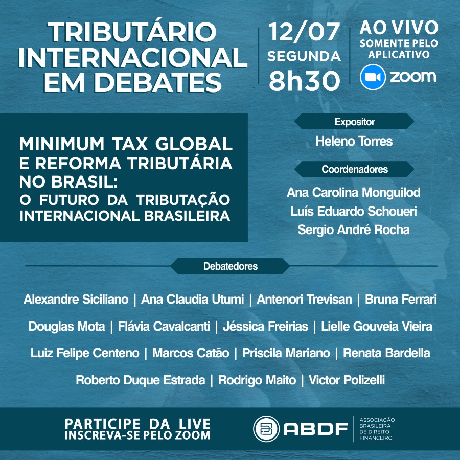 No dia 12 de julho, às 8:30h, realizaremos a primeira edição do “TRIBUTÁRIO INTERNACIONAL EM DEBATES” através do zoom em um formato aberto para participações voluntárias da audiência inscrita. O expositor nesta ocasião será o presidente da ABDF, HELENO TORRES, que falará sobre o tema “MINIMUM TAX GLOBAL E REFORMA TRIBUTÁRIA NO BRASIL: O FUTURO DA TRIBUTAÇÃO INTERNACIONAL BRASILEIRA”.