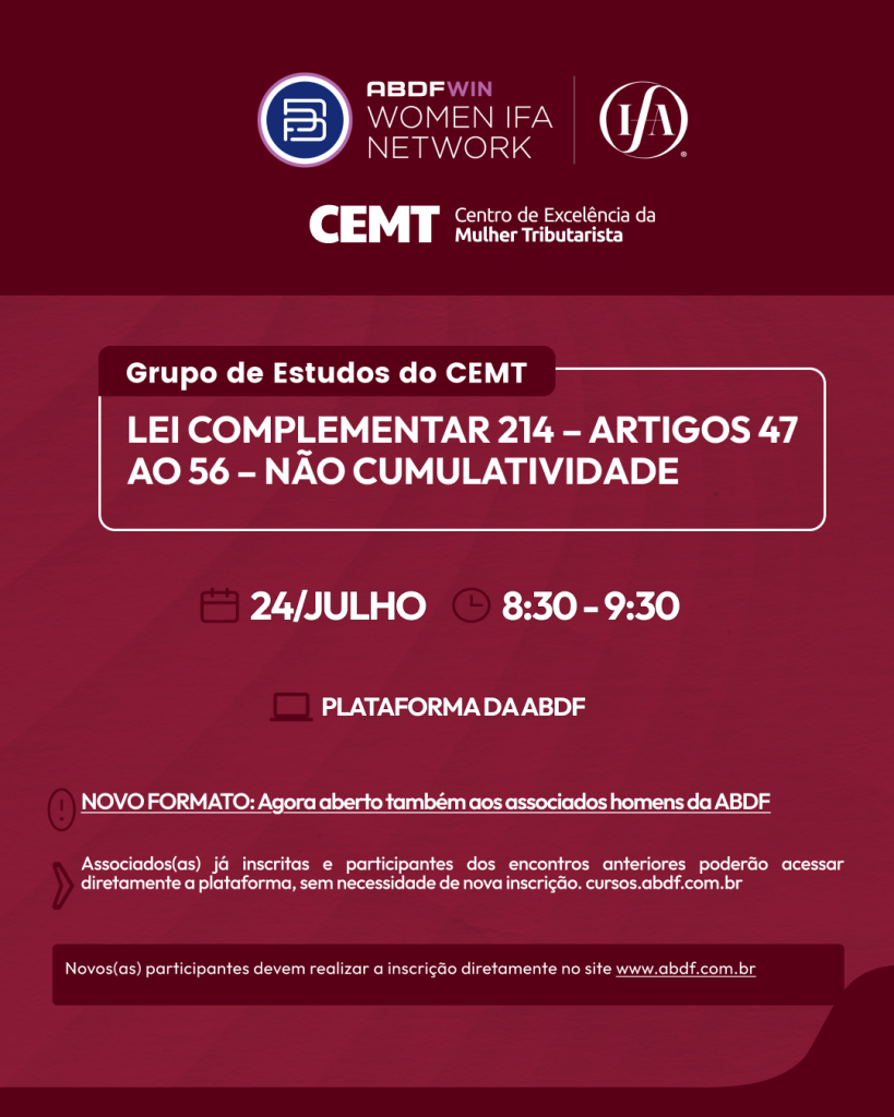 O Centro de Excelência da Mulher Tributarista (CEMT) da ABDF WIN Brasil convida suas associadas para o próximo encontro do Grupo de Estudos dedicado à Reforma Tributária.