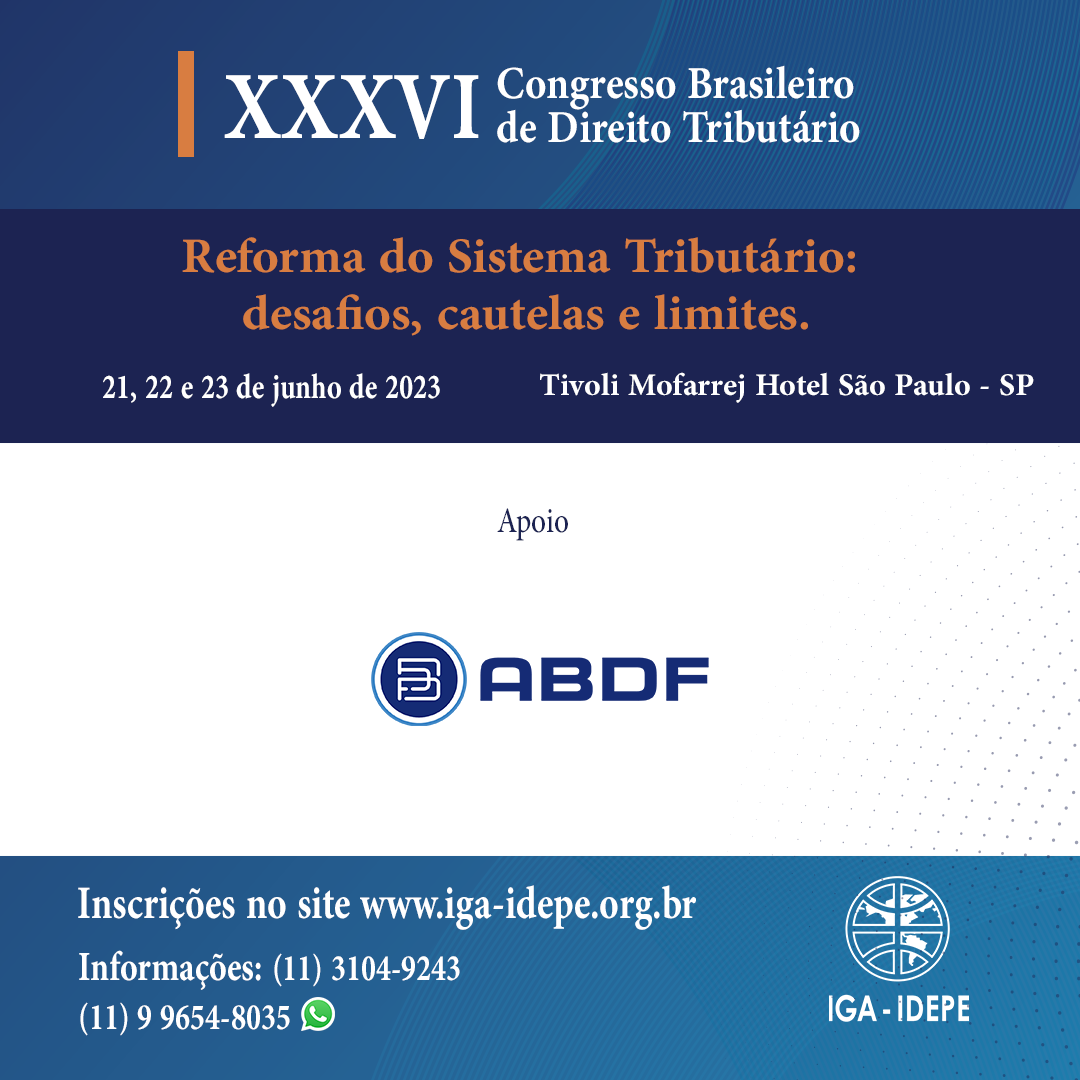 A ABDF apoia o XXXVI CONGRESSO BRASILEIRO DE DIREITO TRIBUTÁRIO, que será realizado pelo Instituto Geraldo Ataliba – IDEPE realizará, nos dias 21, 22 e 23 de junho de 2023, no Tivoli Hotel, em São Paulo/SP.