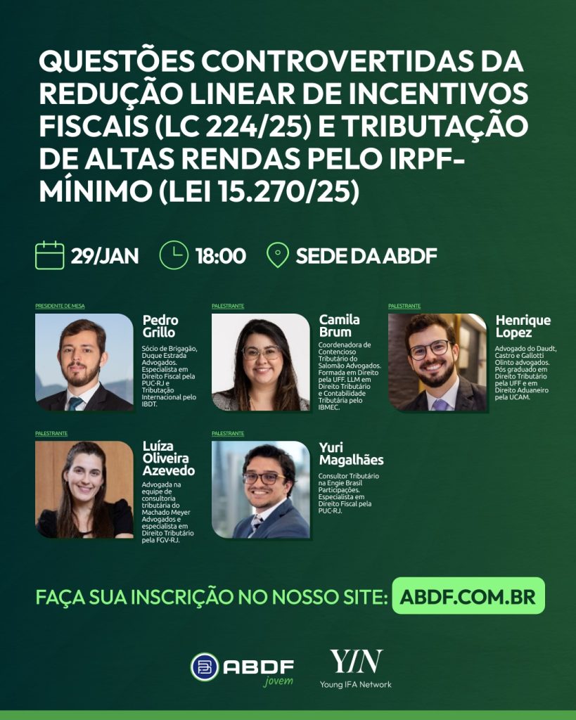 ABDF JOVEM – QUESTÕES CONTROVERTIDAS DA REDUÇÃO LINEAR DE INCENTIVOS FISCAIS (LC 224/25) E TRIBUTAÇÃO DE ALTAS RENDAS PELO IRPF-MÍNIMO (LEI 15.270/25)