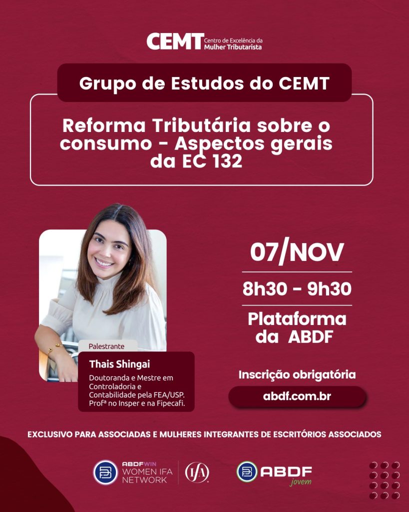 O Centro de Excelência da Mulher Tributarista (CEMT) da ABDF WIN Brasil convida suas associadas para o segundo encontro do Grupo de Estudos sobre “Reforma Tributária sobre o consumo – Aspectos gerais da EC 132”, que será realizado no dia 07 de novembro, às 8h30, pela plataforma de cursos da ABDF.