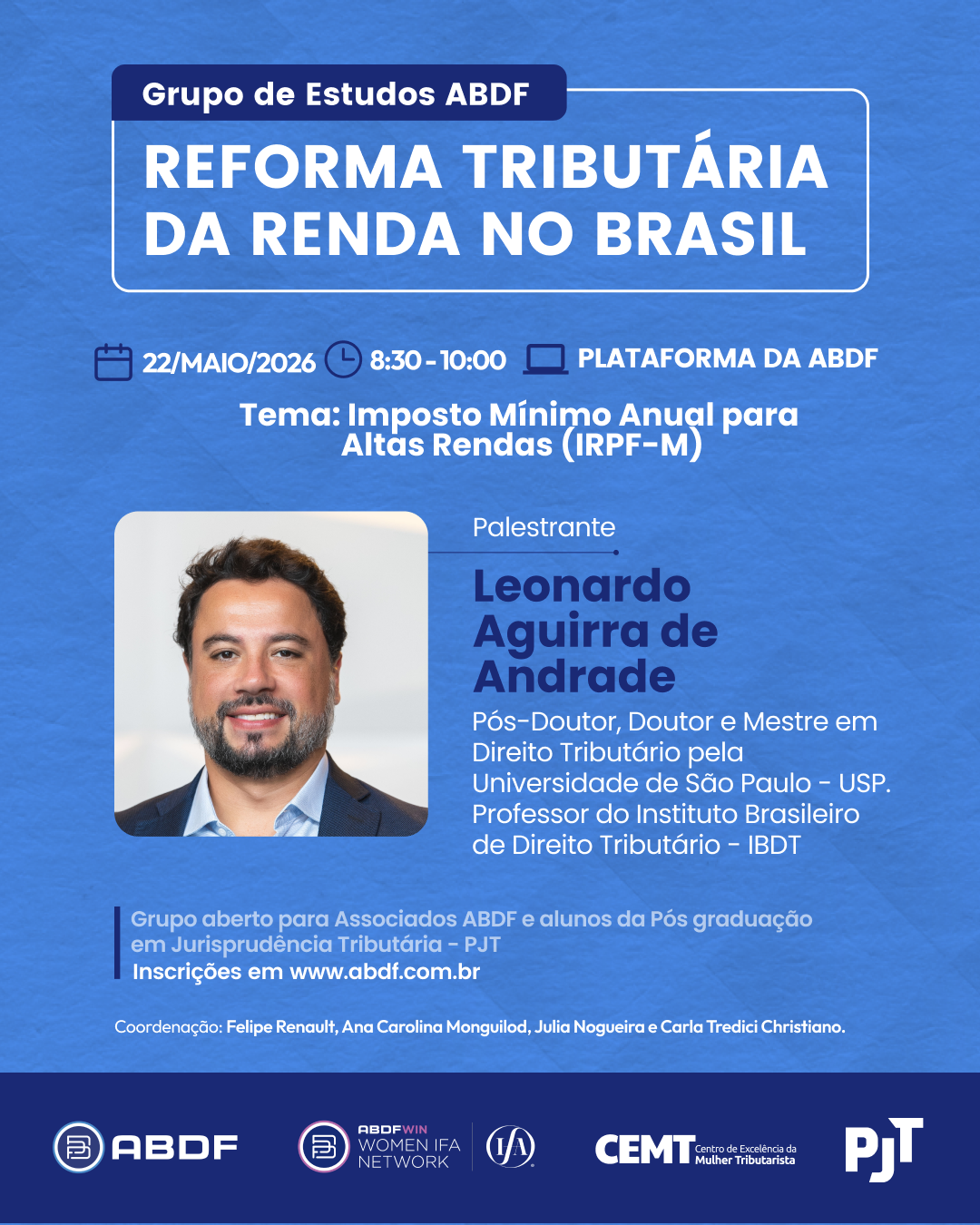 No dia 22 de maio será realizado encontro do Grupo de Estudos ABDF – Reforma Tributária da Renda no Brasil, promovido pela Associação Brasileira de Direito Financeiro – ABDF.