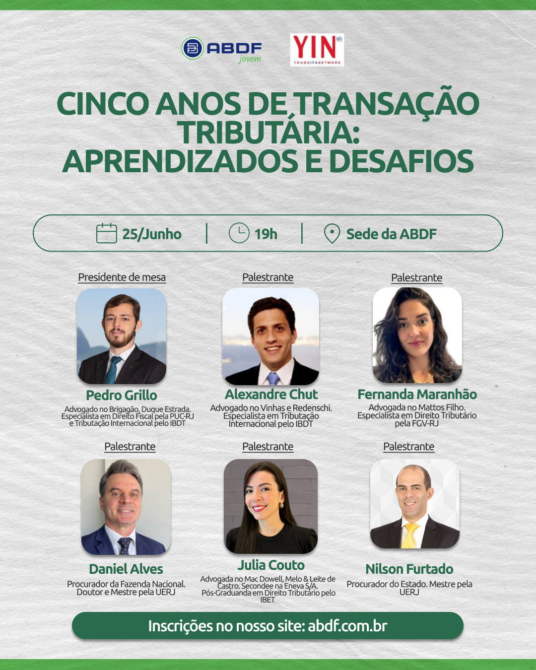 A ABDF Jovem convida para o evento “Cinco anos de transação tributária: aprendizados e desafios”, que será realizado em formato híbrido — presencialmente na sede da ABDF e com transmissão online pelo YouTube.