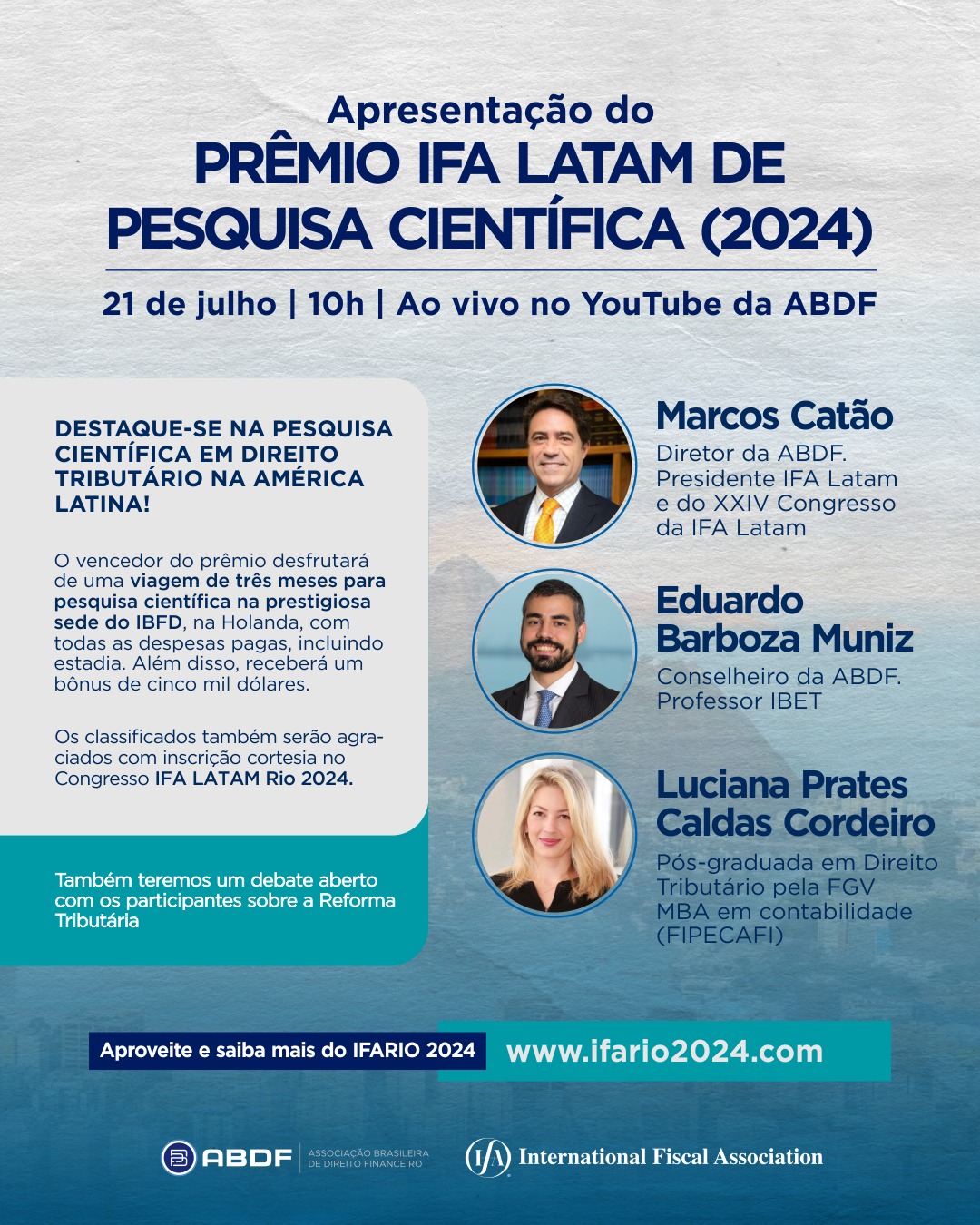 📚 Os melhores classificados também serão agraciados com uma inscrição cortesia para o Congresso IFA LATAM Rio 2024. Será uma chance única de se conectar com especialistas renomados e ampliar sua rede de contatos na área do Direito Tributário.