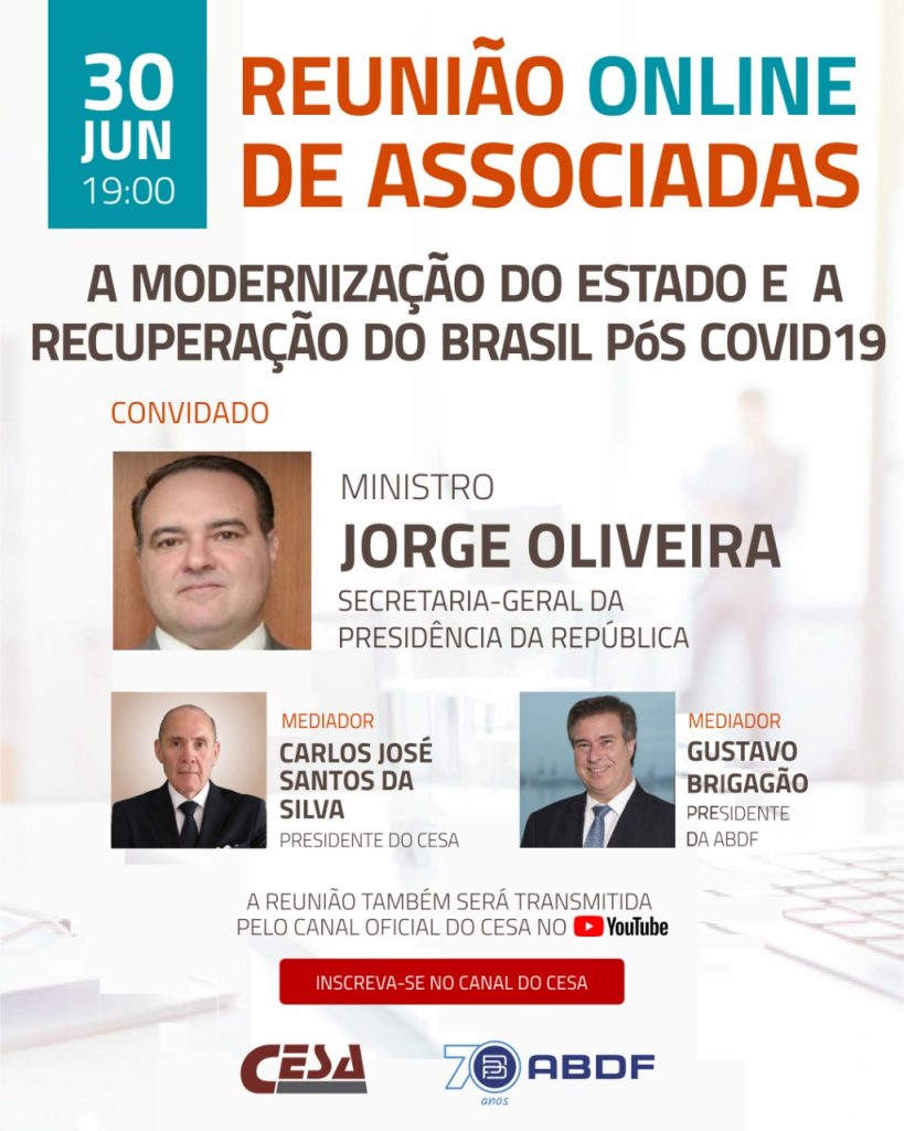 O MINISTRO JORGE OLIVEIRA participará da Reunião Online de Associadas do Cesa, em parceria com a ABDF, sobre “A modernização do Estado e a recuperação do Brasil pós Covid 19”. CARLOS JOSÉ SANTOS DA SILVA e GUSTAVO BRIGAGÃO serão os debatedores do evento, que ocorrerá no dia 30/06, às 19h