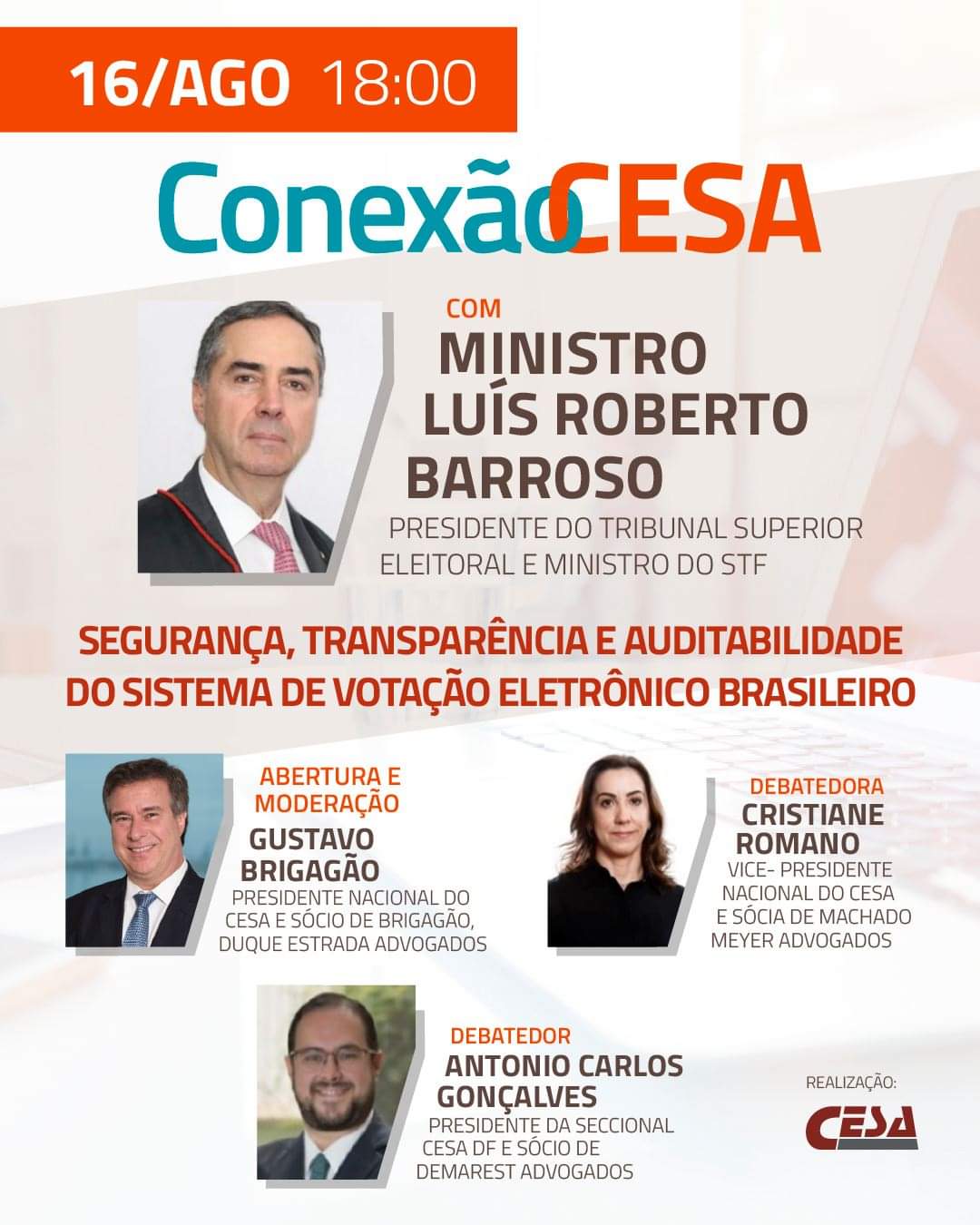 A ABDF apoia o evento “ConexãoCESA com o Ministro Luís Roberto Barroso” que será realizado no dia 16 de agosto, às 18h, sobre o tema “Segurança, Transparência e Auditabilidade do Sistema de Votação Eletrônico Brasileiro“.