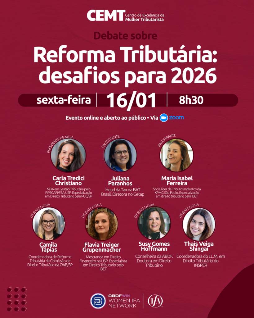 Nesta sexta-feira, 16 de janeiro, às 8h30, o Centro de Excelência da Mulher Tributarista (CEMT) da ABDF WIN Brasil promove o primeiro encontro aberto de 2026, com o tema “Reforma Tributária: desafios para 2026”.