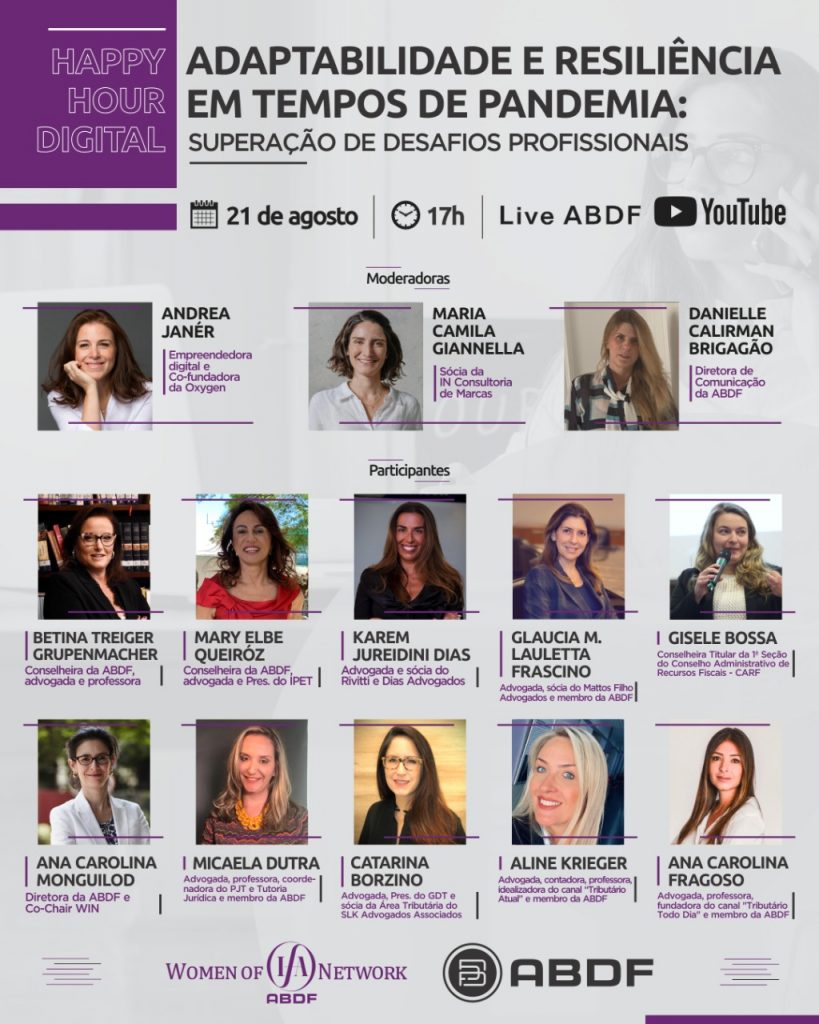No dia 21/08, às 17h, realizaremos o Happy Hour Digital da WIN. Será um evento de networking, em que mulheres renomadas do meio jurídico debaterão a “Adaptabilidade e resiliência em tempos de pandemia: superação de desafios profissionais”. ANDREA JANÉR, MARIA CAMILA GIANNELLA e DANIELLE BRIGAGÃO irão mediar o evento, que contará com a presença das queridas advogadas tributaristas BETINA TREIGER GRUPENMACHER, MARY ELBE QUEIRÓZ, KAREM JUREIDINI DIAS, GLAUCIA M. LAULETTA FRASCINO, GISELE BOSSA, ANA CAROLINA MONGUILOD, MICAELA DUTRA, CATARINA BORZINO, ALINE KRIEGER e ANA CAROLINA FRAGOSO.