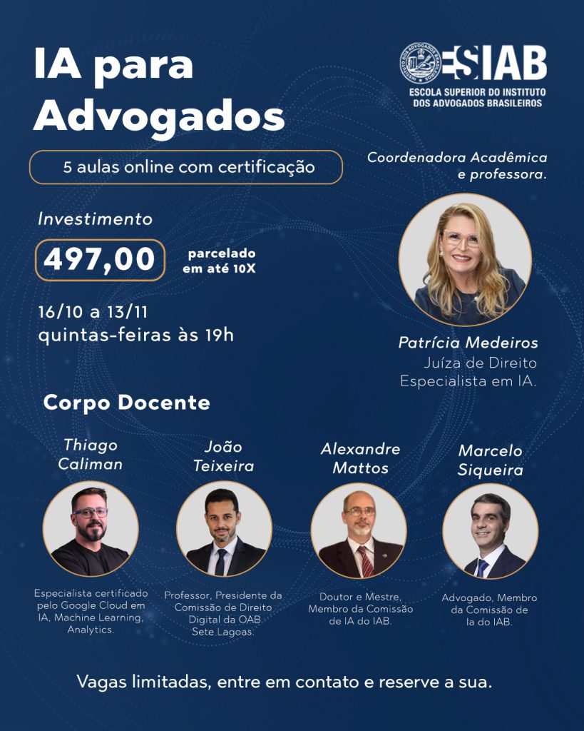 A ABDF informa que estão abertas as inscrições para o curso “IA para Advogados – O que precisa saber para usar”, promovido pela IAB Nacional.