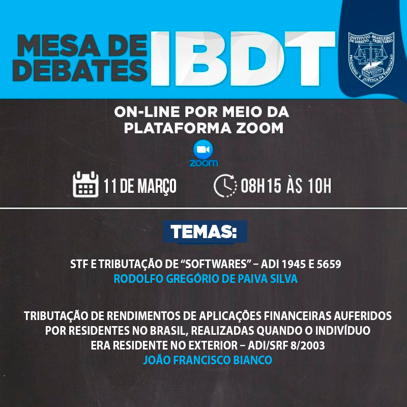 Confira a pauta da mesa de debates do IBDT desta quinta-feira, 11 de março. Assuntos recentes, como a discussão no STF sobre a tributação de “softwares” serão debatidos, além da Tributação de rendimentos de aplicações financeiras auferidos por residentes no Brasil.