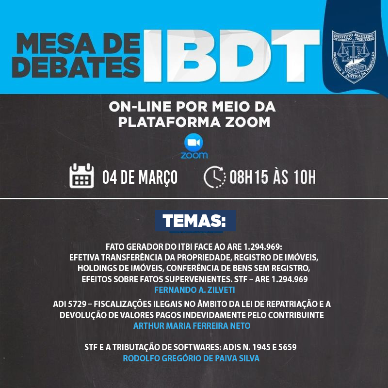IBDT – Mesa de debate Data: 4/3 Horário 8:15h Assista no site do IBDT. + Adicionar ao Calendário do Google + Exportar para iCal Data 04 / mar / 2021 Expired! Horário 08:15 Categoria OUTROS