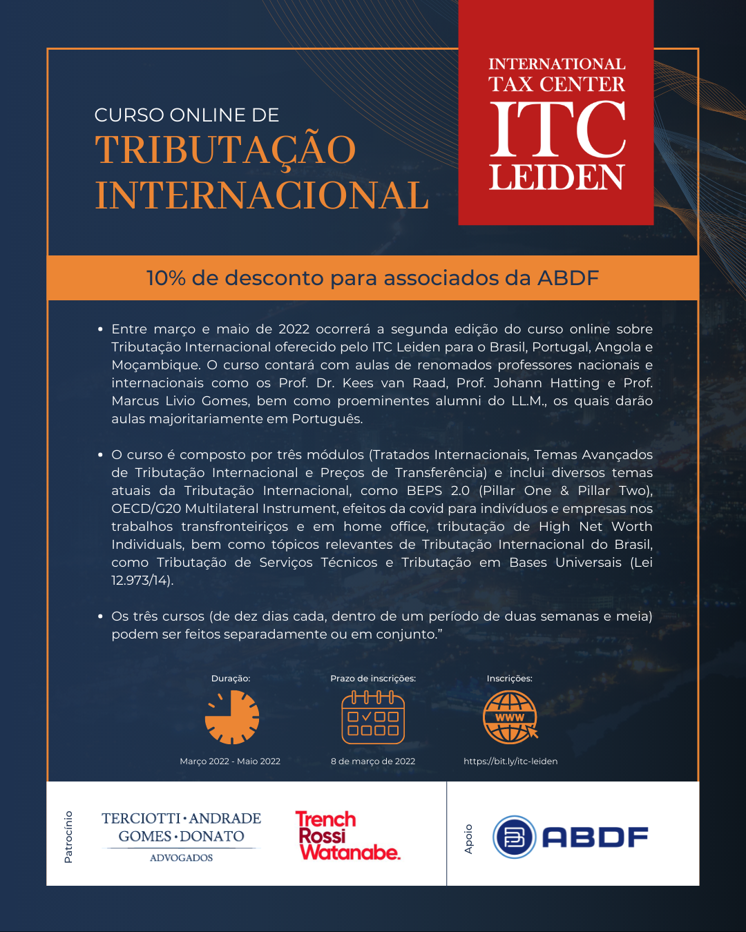 A ABDF apoia o curso online de TRIBUTAÇÃO INTERNACIONAL realizado pela International TAX Center – ITC LEIDEN. Associados ABDF possuem 10% de desconto no valor da inscrição.