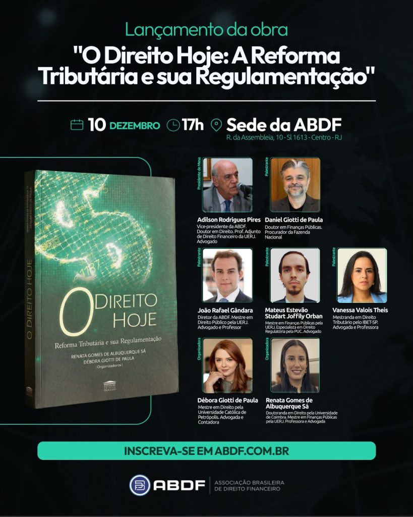 A ABDF convida para o lançamento do livro O Direito Hoje: A Reforma Tributária e sua Regulamentação, a ser realizado no dia 10 de dezembro de 2025, às 17h, presencialmente na sede da ABDF.