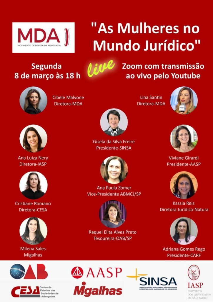 Em comemoração ao dia da mulher, o Movimento em Defesa da Advocacia – MDA realizará o webinar “As Mulheres no Mundo Jurídico”. A WIN Brasil – Women of IFA Network apoia esta iniciativa que reunirá grandes nomes femininos do meio jurídico.