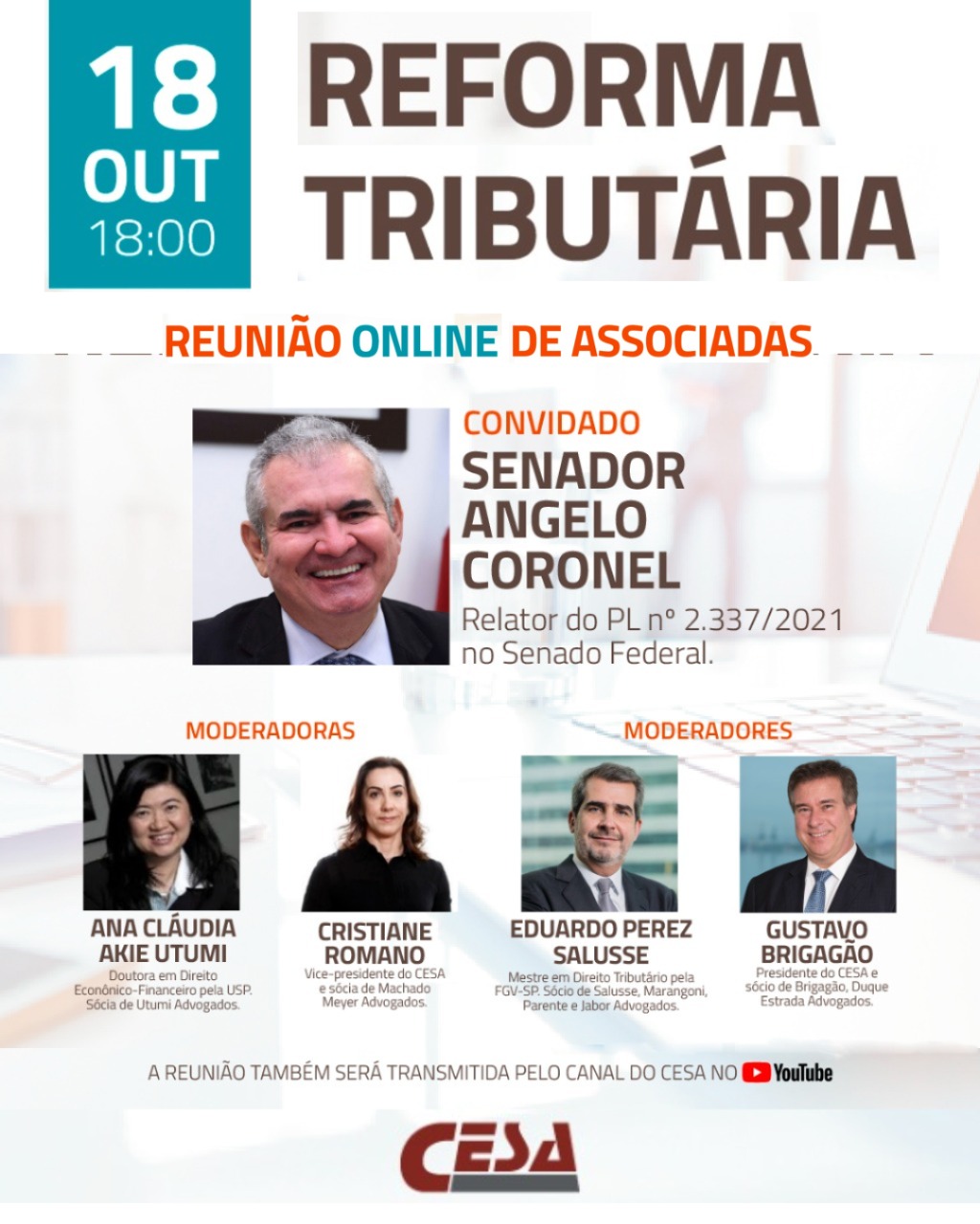 A ABDF apoia o próximo webinar do CESA que receberá o senador Angelo Coronel, relator do Pl nº 2.337/2021, para discutir o tema “Reforma Tributária”.