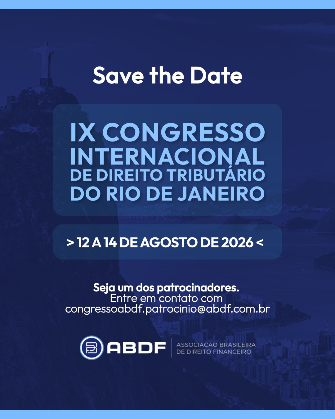 A Associação Brasileira de Direito Financeiro (ABDF) informa que o IX Congresso Internacional de Direito Tributário do Rio de Janeiro será realizado de 12 a 14 de agosto de 2026.