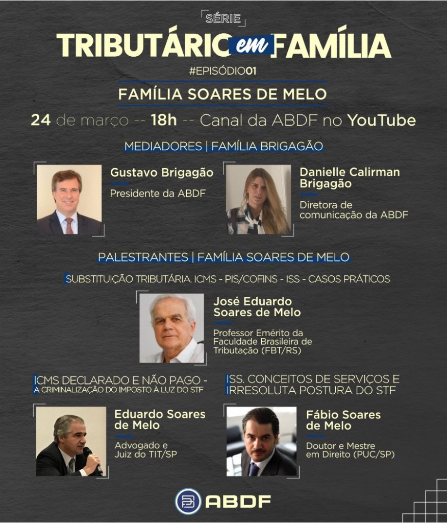 No dia 24/3, às 18h, a Série “Tributário em Família” terá o seu primeiro episódio, em formato webinar, com a presença da Família SOARES DE MELO. O evento será realizado no canal da ABDF no Youtube, e será mediado pela Família Brigagão, composta pela diretora de comunicação da ABDF, DANIELLE BRIGAGÃO e GUSTAVO BRIGAGÃO, presidente da ABDF. Receberemos os ilustres convidados JOSÉ EDUARDO SOARES DE MELO, EDUARDO SOARES DE MELO e FÁBIO SOARES DE MELO, para tratar importantes temas como “Substituição Tributária. ICMS – PIS/COFINS – ISS – Casos Práticos”, “ICMS Declarado e não Pago – : A Criminalização do Imposto à Luz do STF’” e “ISS. Conceitos de Serviços e Irresoluta Postura do STF”.