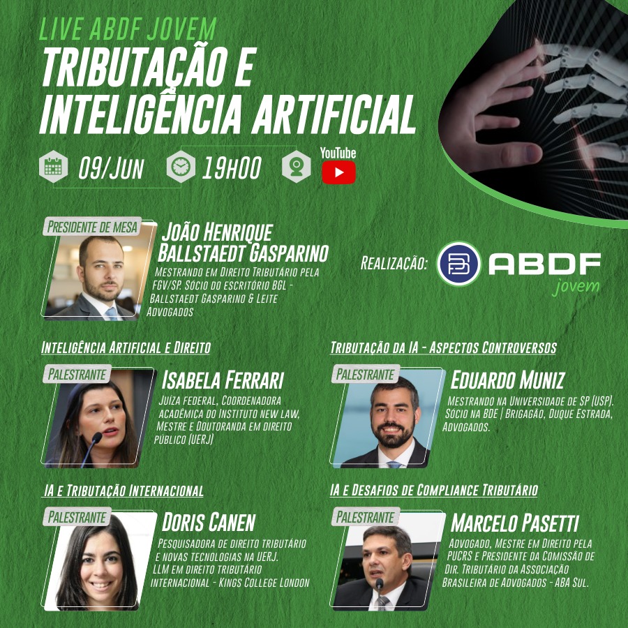 No dia 9/6, às 19h, a ABDF Jovem realizará o webinar “TRIBUTAÇÃO E INTELIGÊNCIA ARTIFICIAL” no canal da ABDF no YouTube.