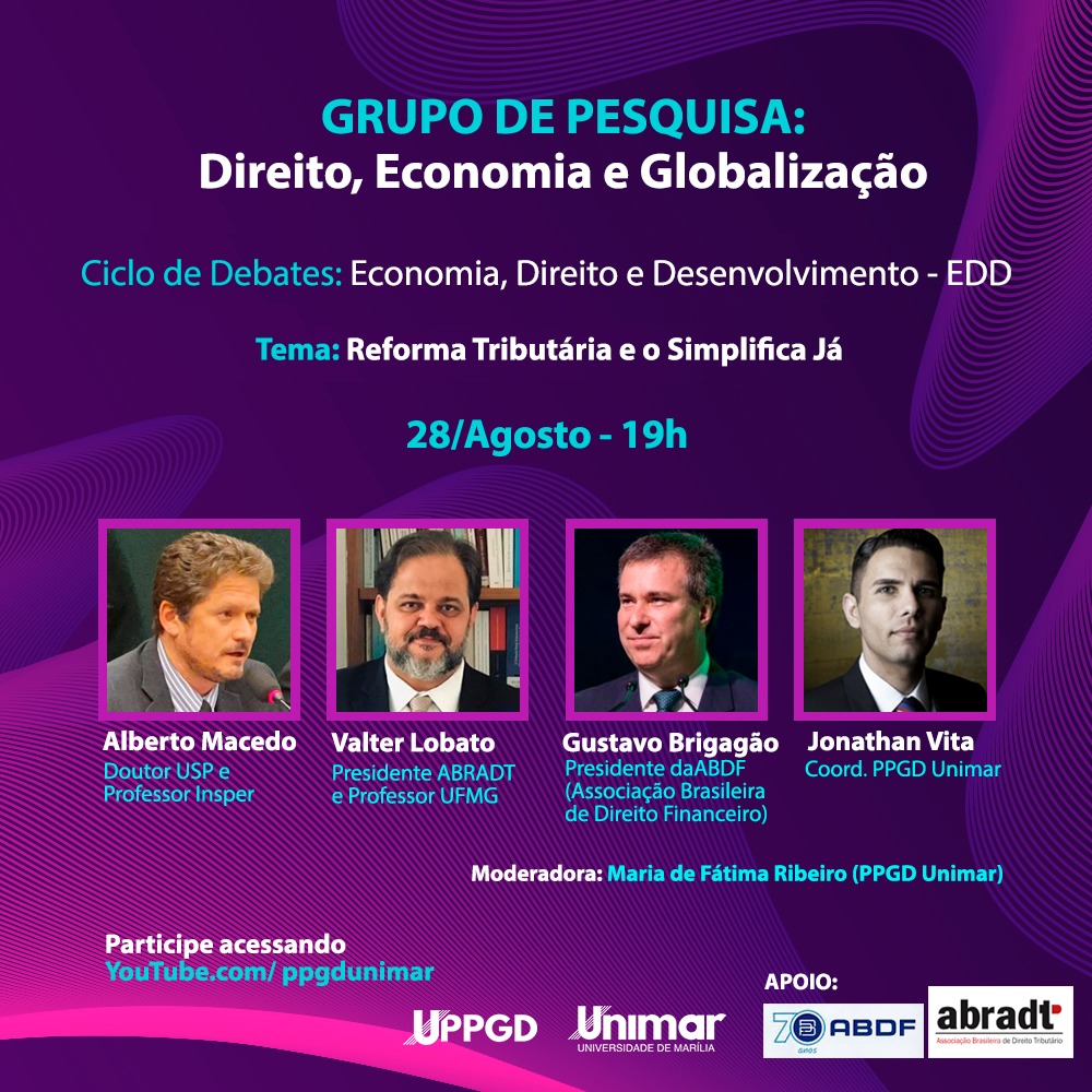 No dia 28/08, às 19h, ocorrerá o Ciclo de Debates: Economia, Direito e Desenvolvimento – EDD, promovido pelo UPPGD – Programa de Pós-Graduação em Direito – e pela Unimar – Universidade de Marília. O tema em pauta é “Reforma Tributária e o Simplifica Já”. O evento conta com o apoio da ABDF e da ABRADT.