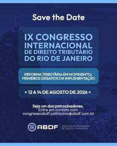 12 agosto - 14 agosto SAVE THE DATE – CONGRESSO ABDF 2026 – IX CONGRESSO INTERNACIONAL DE DIREITO TRIBUTÁRIO DO RIO DE JANEIRO